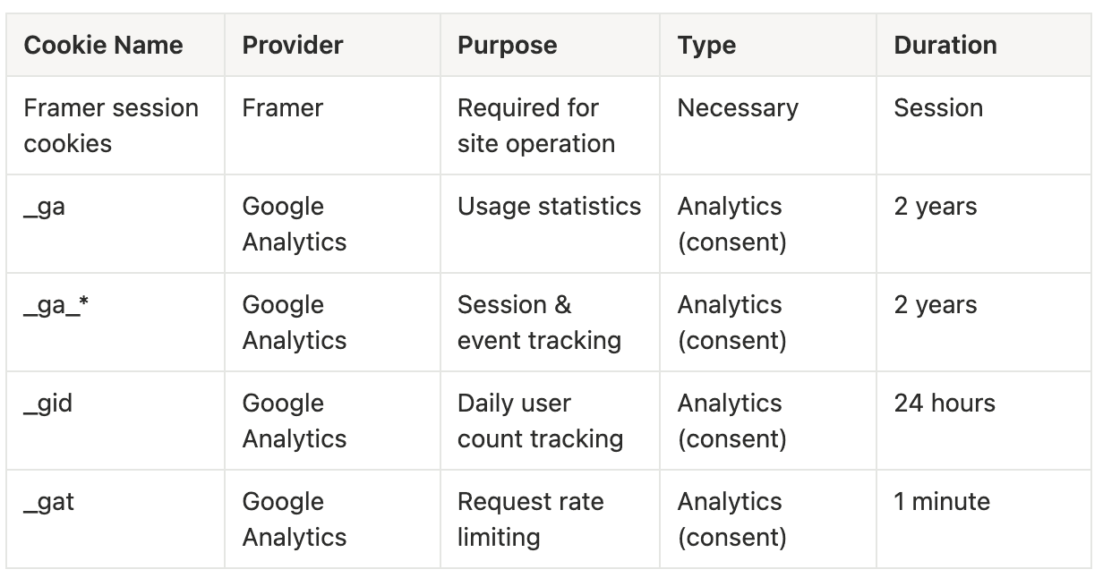 (Indicative list — dependent on Framer & GA4 settings.)
