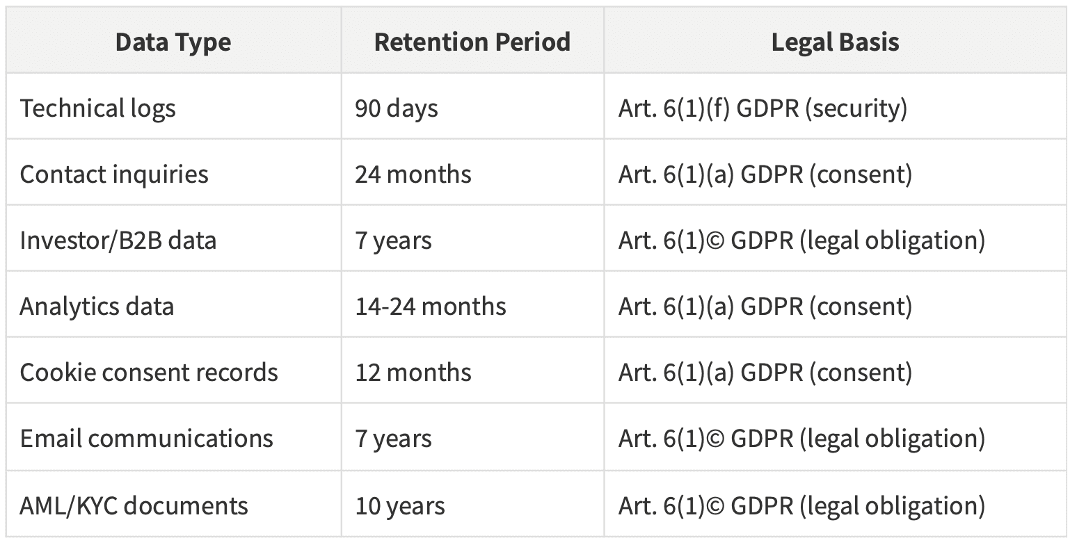 Retention: Investor and B2B correspondence retained for 7 years in accordance with German and Swiss tax and commercial law requirements (§ 257 HGB, Swiss CO Art. 958). After 7 years, data is deleted unless legal obligations require longer retention.
